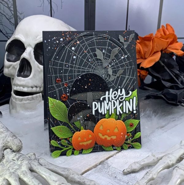 Amy created this creepy design with a heat embossed spider web background and die cut mushrooms and pumpkins. The green leaves are a nice breakup of the darker colors and the white heat embossed sentiment really pops. But the best thing about this card is parts of it glow in the dark! Check it out over at the Prairie Paper and Ink blog.