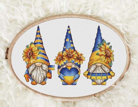 Because the shop is Ukrainian I can’t resist sharing the Ukrainian gnomes, done up in yellow and gold and decorate with Ukrainian flags and sunflowers. The design is 114 by 76 stitches, which comes out to about 8.2 by 5.5 inches, or 21 by 14 cm, on 14 count fabric. This design uses 12 colors and blends.