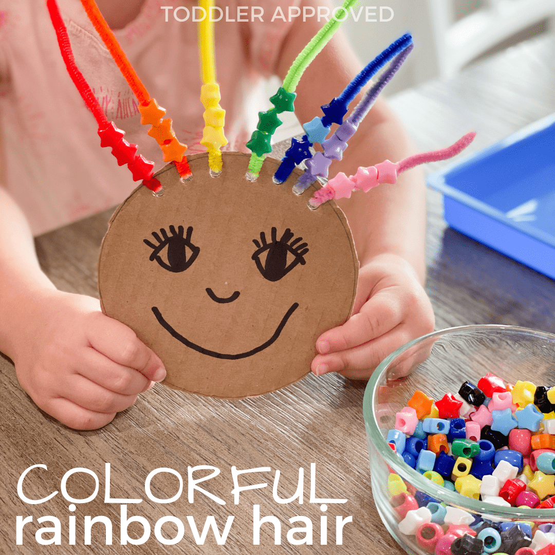 What is a simple fine motor skills activity using beads? Your kids will love this crazy rainbow hair bead activity!