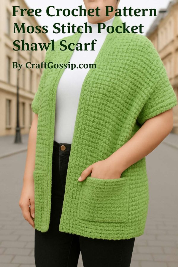 Designed to match your wingspan, this scarf wraps you up perfectly from end to end. The pattern includes easy-to-follow size options from Small to 2XL, so you can tailor it to your exact fit — whether you’re petite, tall, or somewhere in between. And let’s talk about those pockets — big, practical, and perfect for warming your hands or stashing your phone, a snack, or your latest WIP notes.