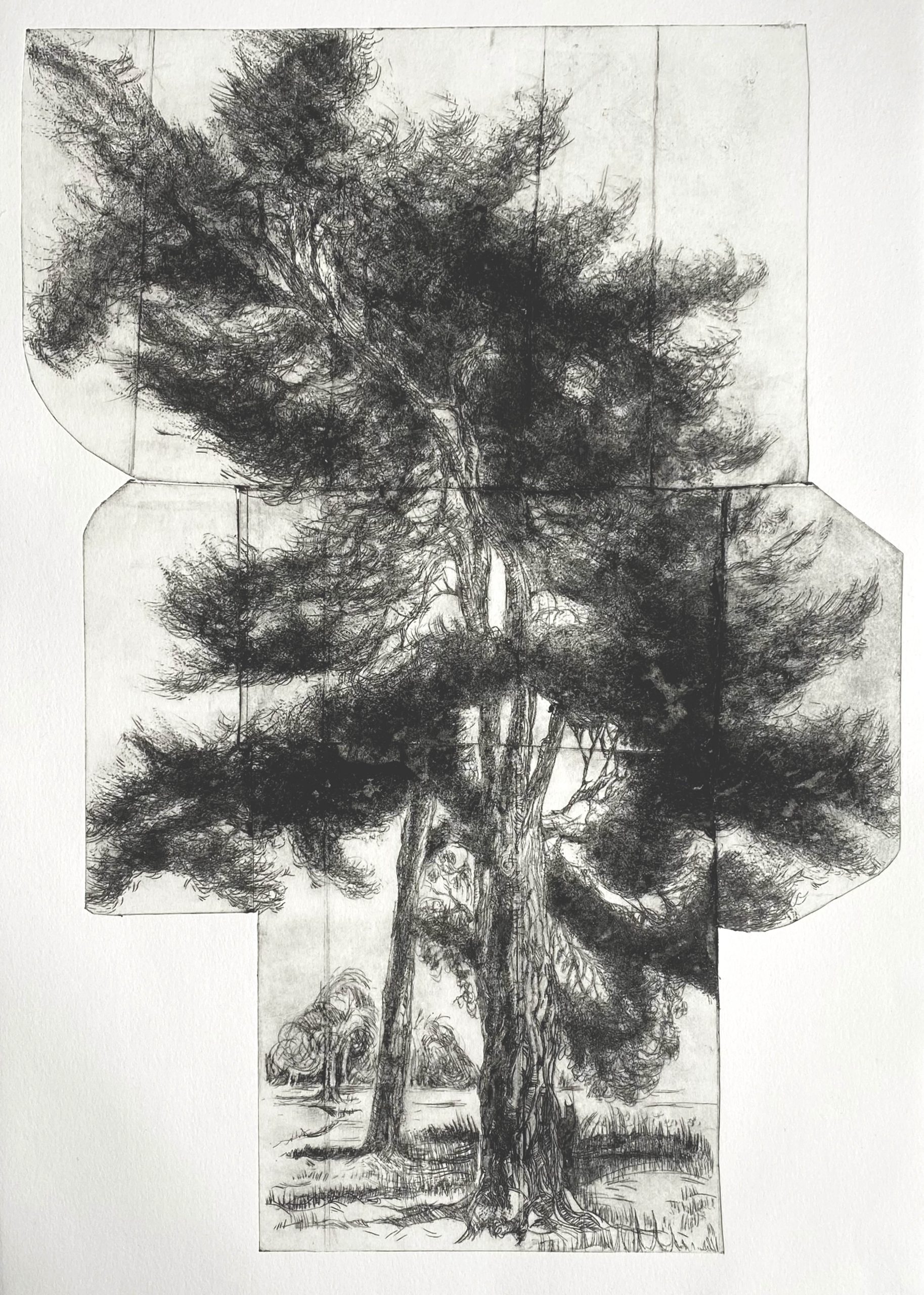 Ky: This project will probably never end – I always remember having a love of trees, maybe a romantic pictorialistic viewpoint, watching them flash by from the car or train window as a child. I recall the loss of a particular avenue of Elms and when they were lost to Dutch Elm disease, it has always stayed with me. As I write this a neighbouring garden is having a tree cut down and I find I get a visceral response hearing the sound of the chainsaw. I feel I want to capture through drawings photos or prints as many trees as I can. The intricacies of each tree, the overall forms – the irony is I am not one for sitting drawing each leaf but I am more interested in trying to get the essence of it onto paper.