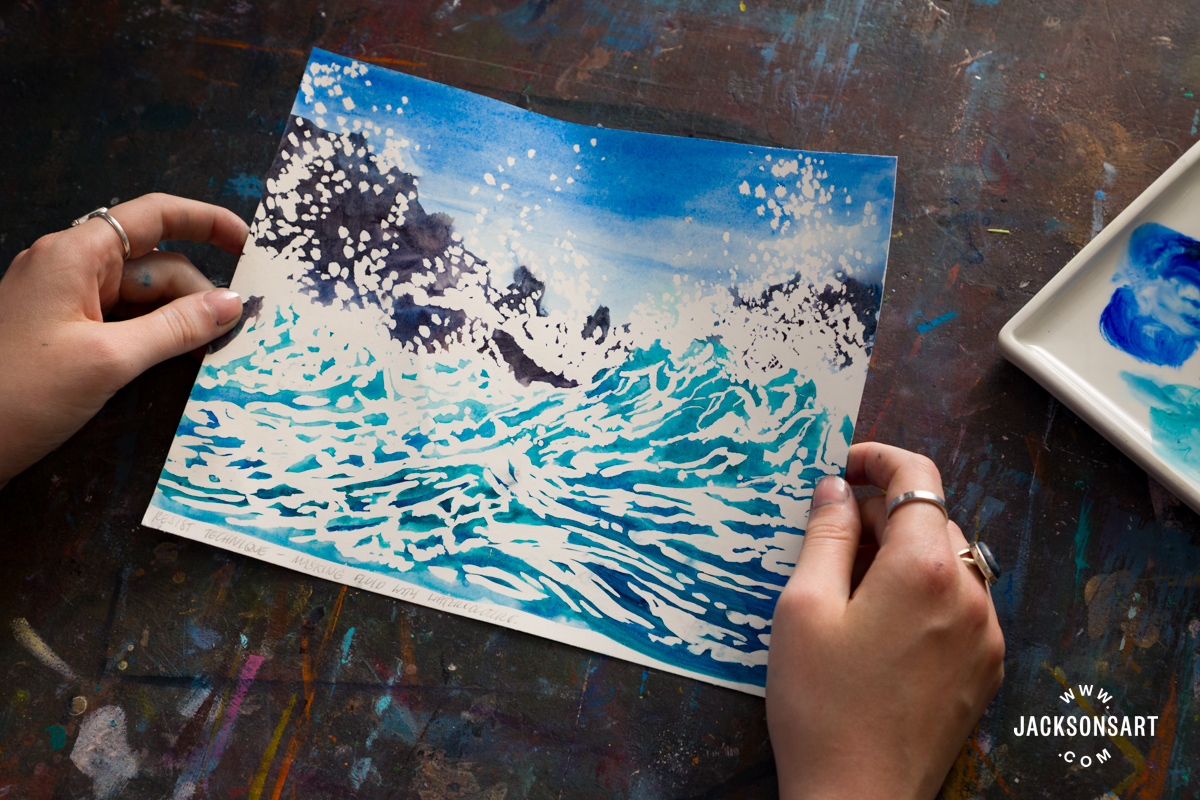 To demonstrate the resist technique with watercolours, I used Jackson’s Masking Fluid in blue, with Jackson’s Artist Watercolour Paints, on a Jackson’s Bockingford Watercolour Pad. For my imagery, I painted stormy waves crashing on some rocks.