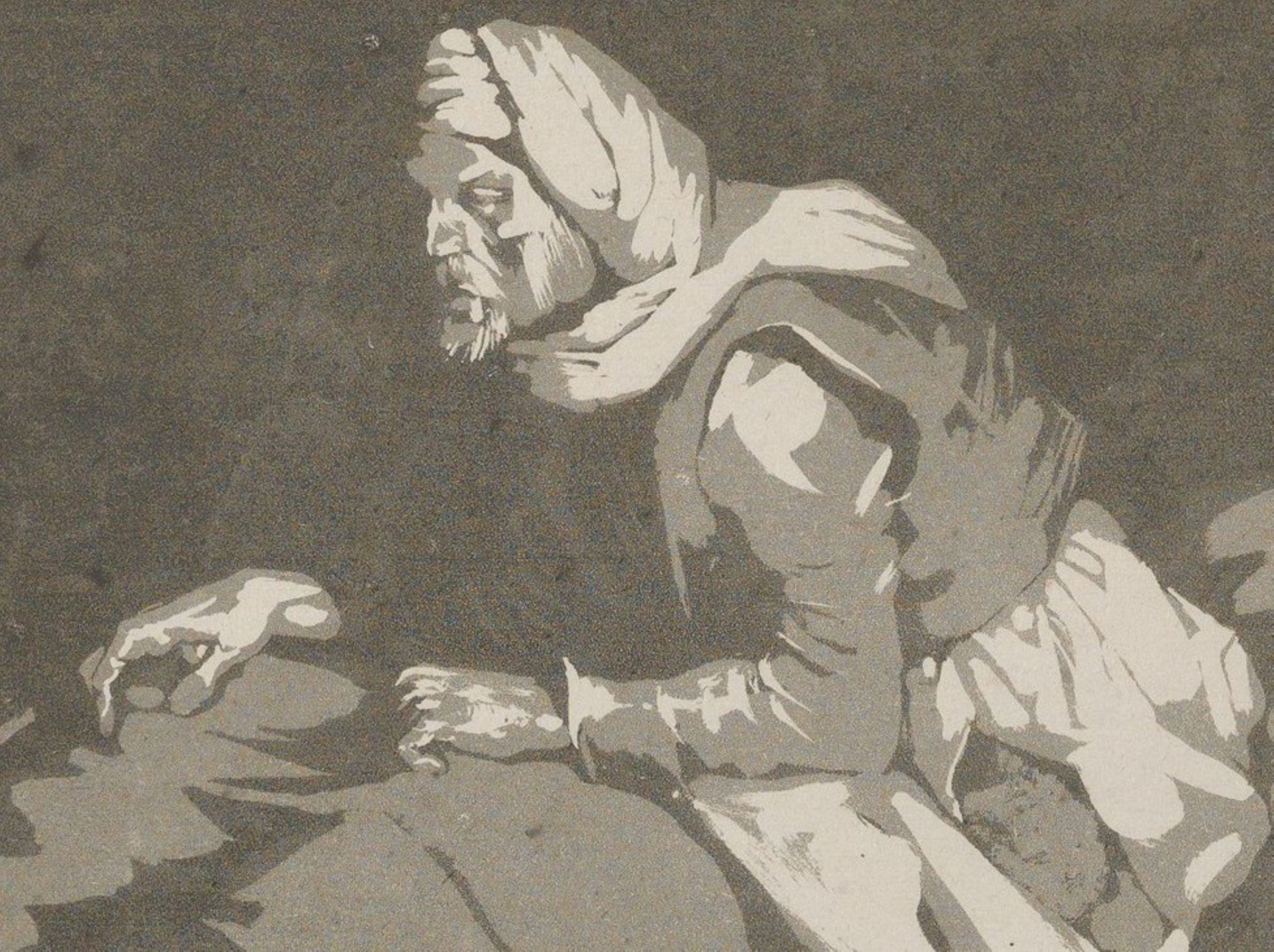 Printmakers also utilise a couple of different resist techniques in etching to block or ‘stop out’ the acid from eating into areas of the plate that they want to keep lighter when it’s printed later. When using an aquatint, layers of varnish are successively applied to the plate to resist the acid and create a gradation of tone. In Interior of a Military Hospital by Delacroix, we see a really clear example of etching aquatint in two stages. First, he has applied varnish to all of the areas that are white on the print to protect them from the acid. He then etched the entire plate to create the grey midtone. If you printed the plate at this stage it would just be white and grey. Next, the plate is removed from the acid, and another layer of varnish is applied over all of the areas of the plate he wanted to keep as this grey midtone. The next dip in the acid etched all of the plate left out of the resist technique, to create the darkest tone.