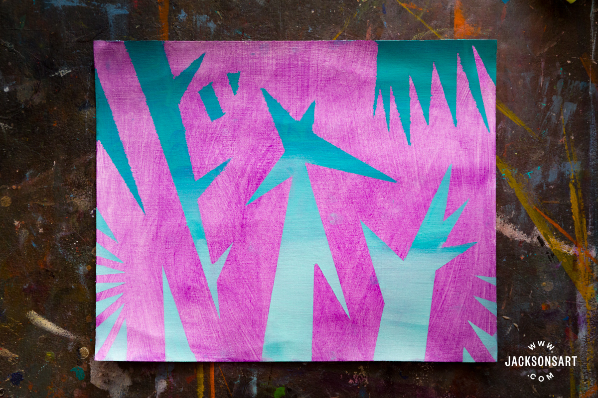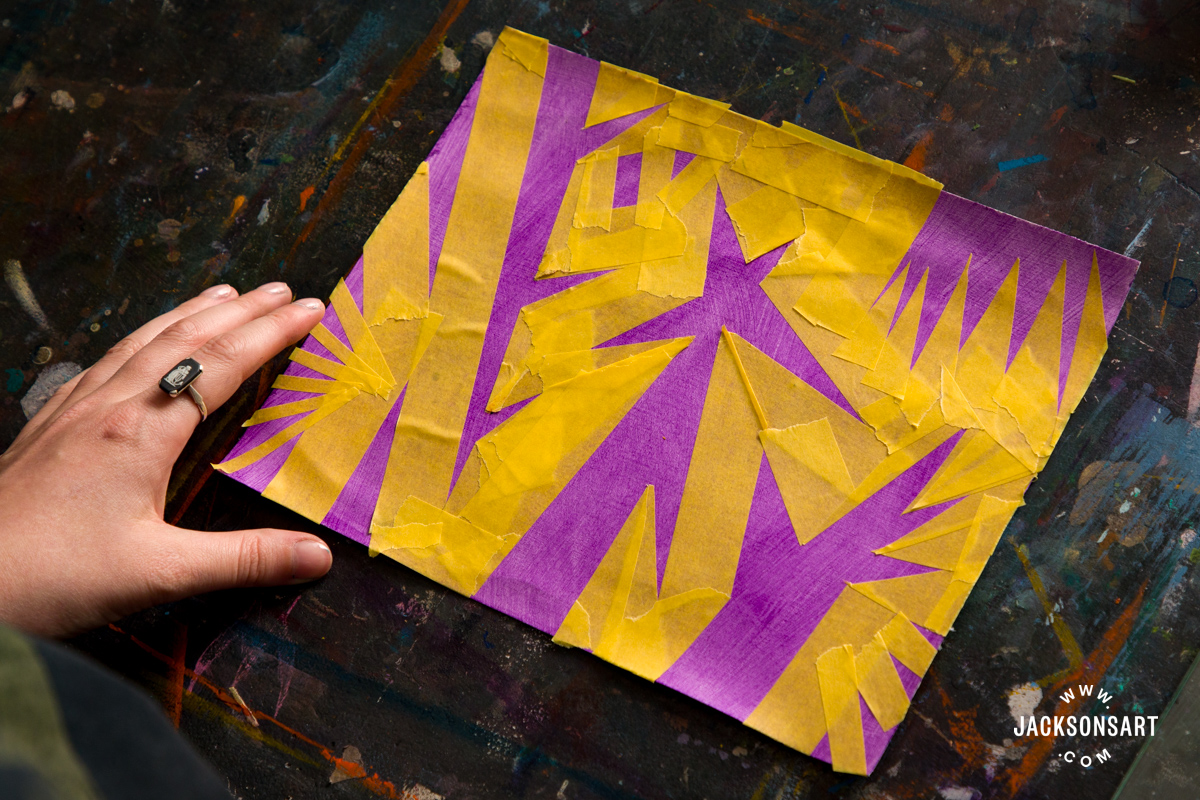 For my first examples, I wanted to demonstrate the resist technique using tape with oil paint, which would also work well with acrylic. For the first example, I used Jackson’s Professional Oil Paint on a sheet from a Jackson’s Oil Paper Block with a purple acrylic ground, with Handover Low Tack Lining Tape. Then, for the second example, I cut out more specific shapes using Handover Professional Masking Tape with a craft knife.