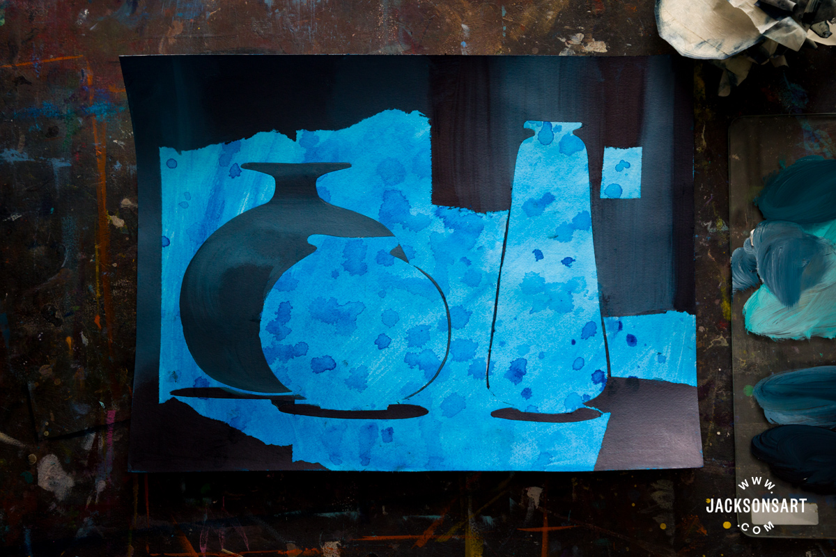 To begin, I prepared a ground where I splattered some blue acrylic paint onto my Jackson’s Oil Paper Block sheet and allowed it to dry.