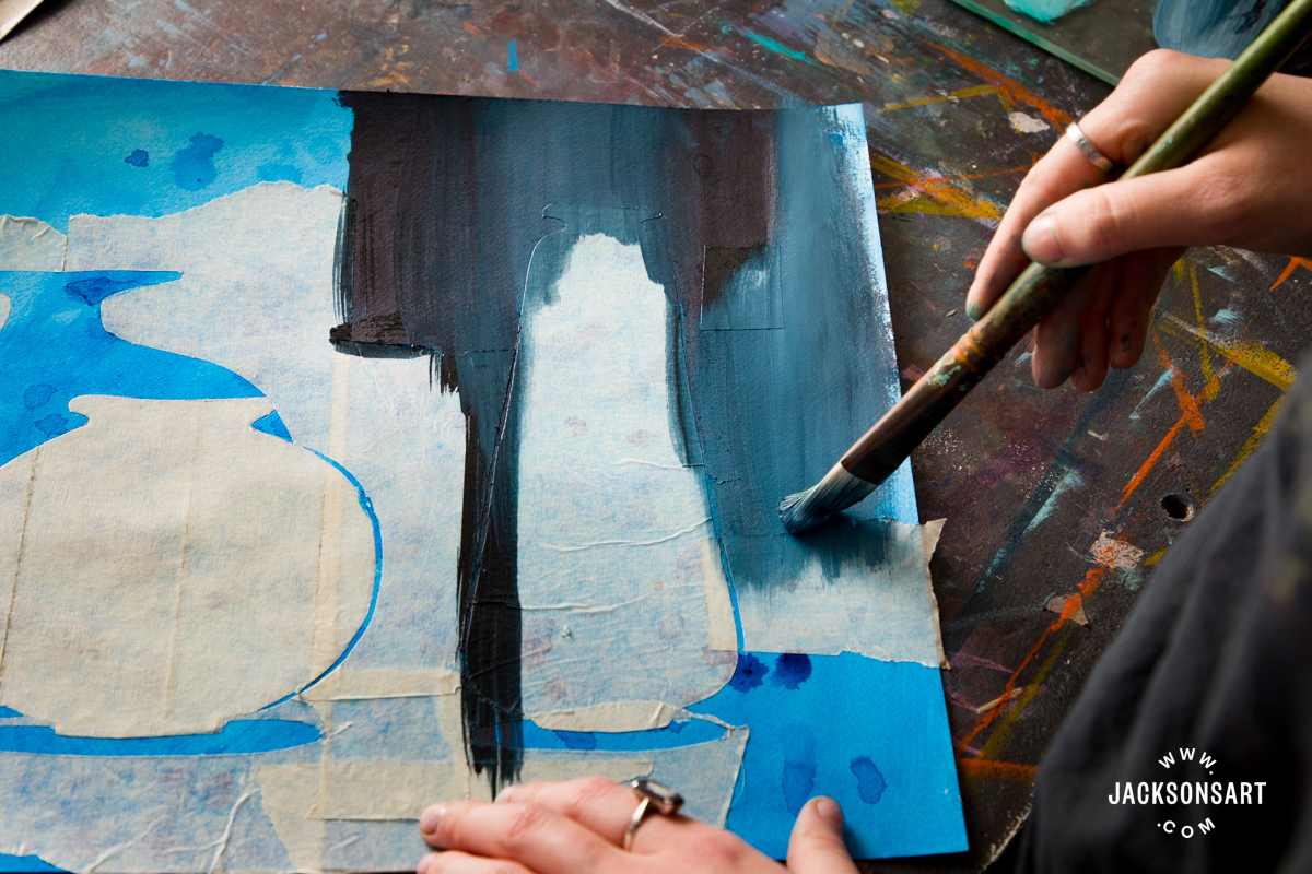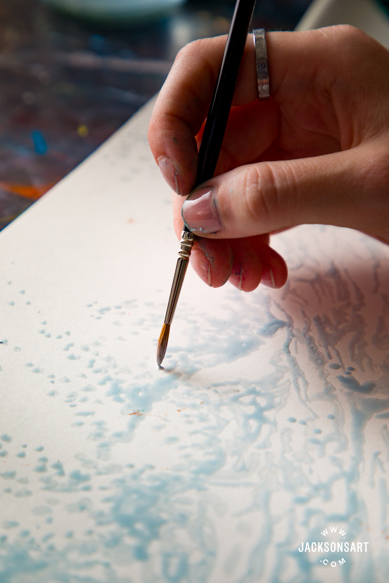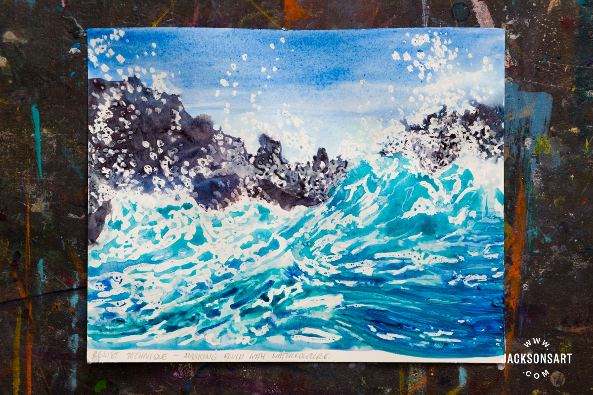 To demonstrate the resist technique with watercolours, I used Jackson’s Masking Fluid in blue, with Jackson’s Artist Watercolour Paints, on a Jackson’s Bockingford Watercolour Pad. For my imagery, I painted stormy waves crashing on some rocks.