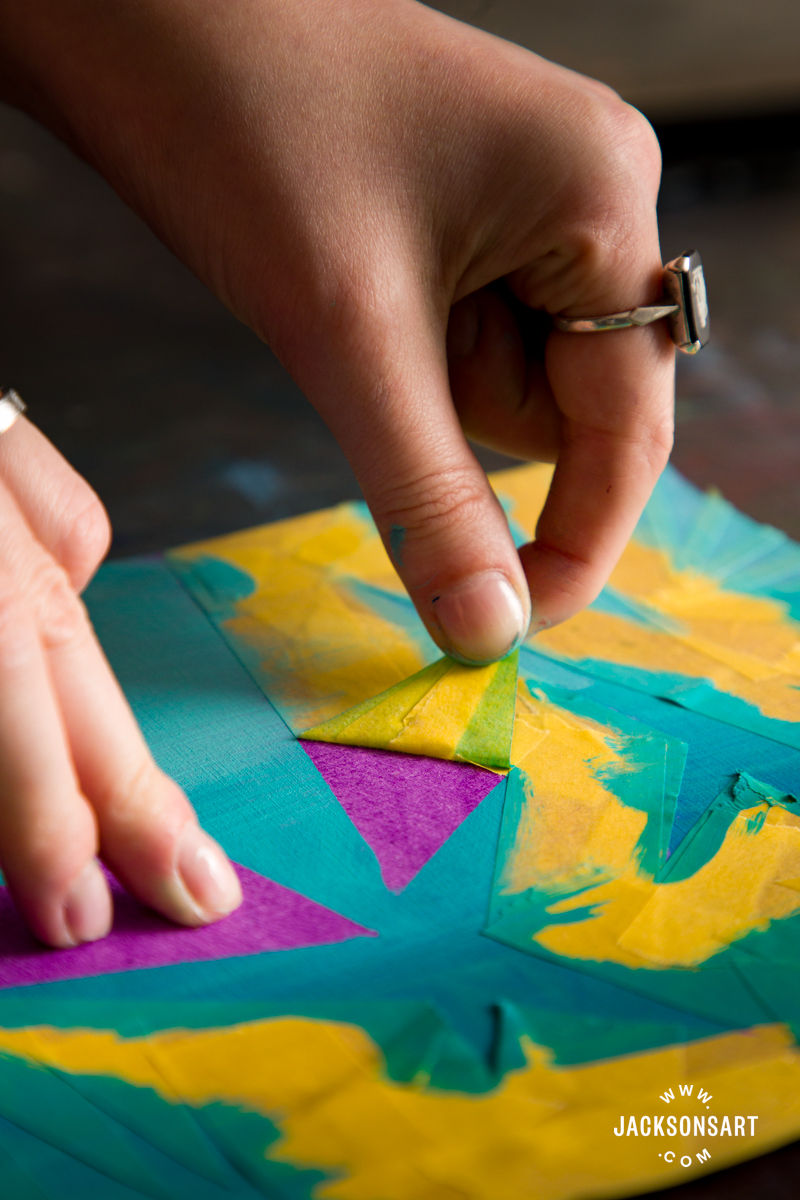 Tips: If you’re using acrylic paint and want to make the edges of your tape especially crisp when using the resist technique, you can seal the tape with clear acrylic over the edge of the tape before painting around it. The technique is described here in the article, Sealing Your Masking Tape for Better Hard Edges in Acrylic Painting.