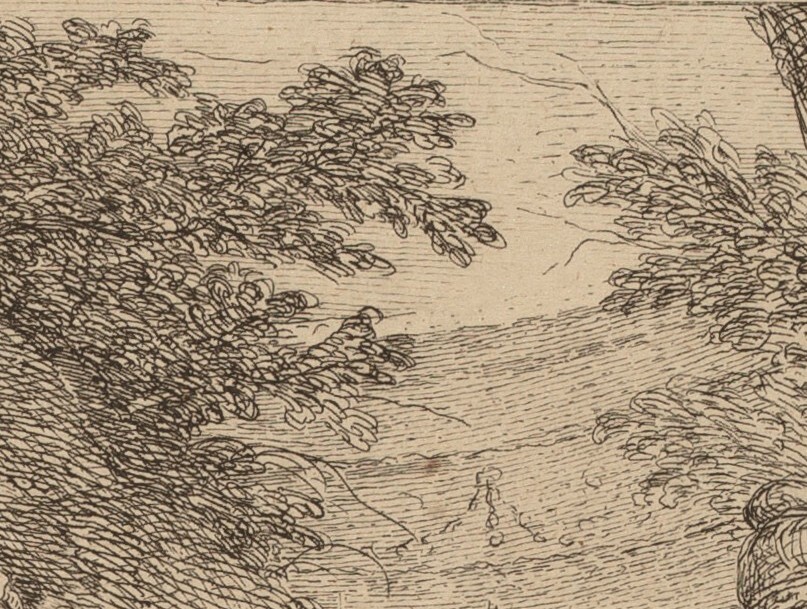 Even without an aquatint, areas of the plate can be preserved using a resist technique with varnish, such as sections of linework the artist wants to keep lighter. The areas not blocked out are etched further, creating darker, wider lines that hold more ink when printed. In this etching, Rinaldo and Armida, by Angelica Kauffman, we can see the variation of tones in lines that have been etched to different depths by using the resist technique. In the cropped detail, the leaves of the tree have been left in the acid for the longest time, with the hillside for a medium length of time, and the light lines in the sky for the shortest.