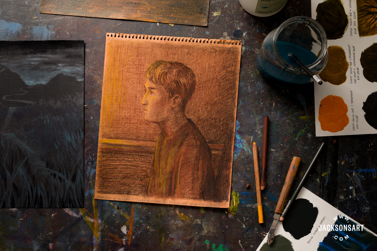 The nocturnal quality of tonalist paintings can also be achieved in drawings. For my example, I wanted to demonstrate making a tonalist portrait using a Conté à Paris sanguine and charcoal pencil, with dim highlights using a warm yellow Caran d’Ache pastel pencil.