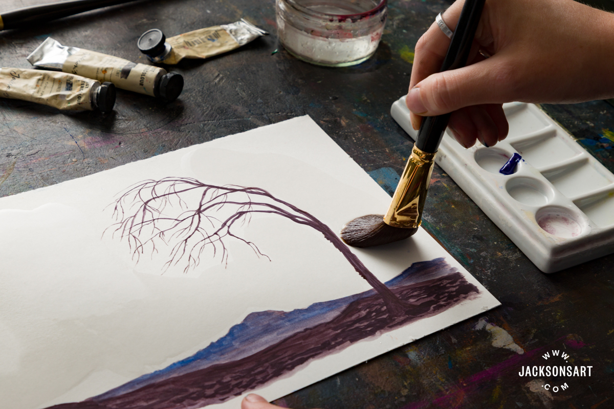 The wet-on-wet technique doesn’t just work when applied to a whole sheet of paper, but can be used to pick out specific areas that you’d like to have a diffused or softened effect. For this example I painted a watercolour of a barren landscape on a dry sheet of Jackson’s Hot Pressed Watercolour Block, with some mountains in the distance, and a bare tree.